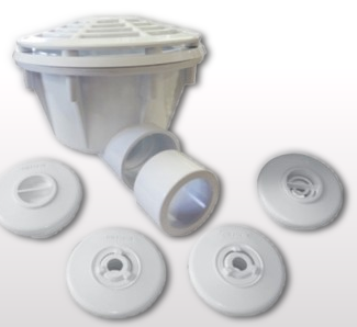Dispositivo para piscinas de vinil com sistema de conexão no flange e adesivo na face no nicho.